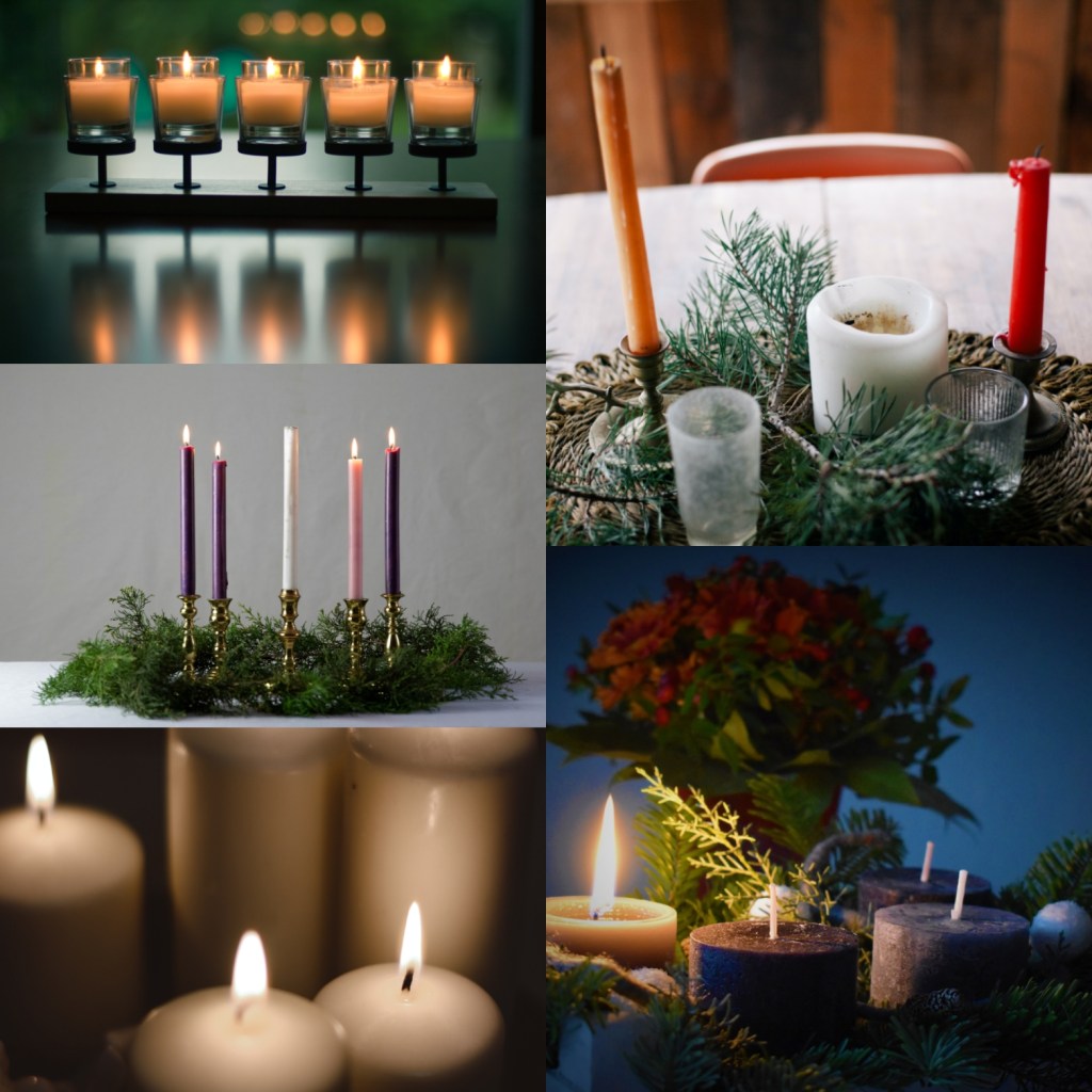 Secondly, you need to think about candles. There is something about a lighted candle or two that adds peace and calmness to a time of worship. For this reason, Advent wreaths are a great addition to Advent celebrations. They include four or five candles, with or without an evergreen wreath or some other wreath-shaped object. Beginning with the first Sunday of Advent (or Wednesday for this class), I light a candle while I read the worship Scriptures. I light an additional candle on each subsequent Sunday (or Wednesday), until by the last Sunday (or Wednesday) all four candles are lit. Sometimes I light a fifth candle on Christmas Day. Traditionally, Advent candles are purple (for week 1, 2, and 4) and pink (for week 3) and white (for Christmas Day), but you can have white candles or green candles or a mix of candles–this is really your choice.